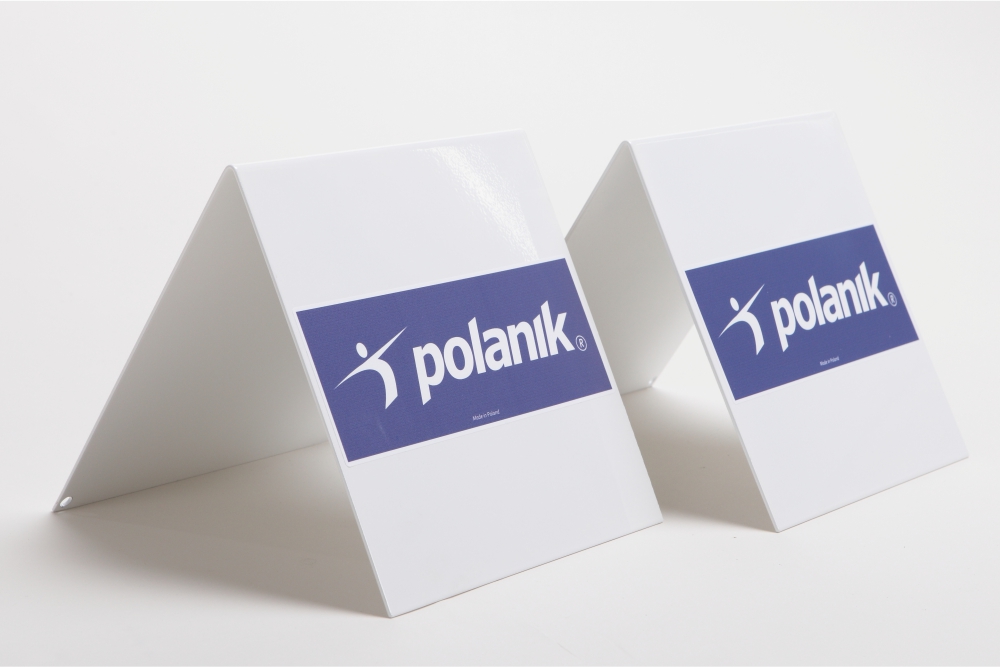 Repères en aluminium laqué. Se placent au niveau de la planche d’appel. Ils offrent un meilleur aperçu de l’épreuve, particulièrement pour le triple saut, où plusieurs planches d’appel sont intégrées à la piste d’élan. Blancs, à rayures sombres. Un set comporte deux repères.